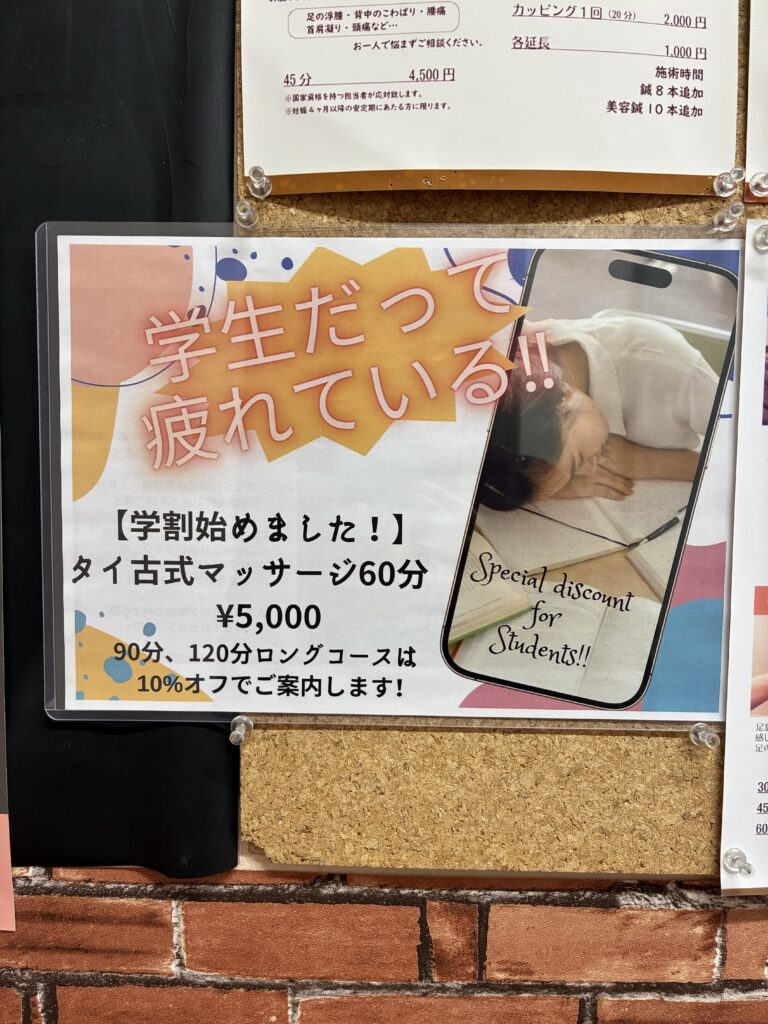鍼灸治療もそうですが、タイ古式マッサージにも『学割』を儲けることにしました!